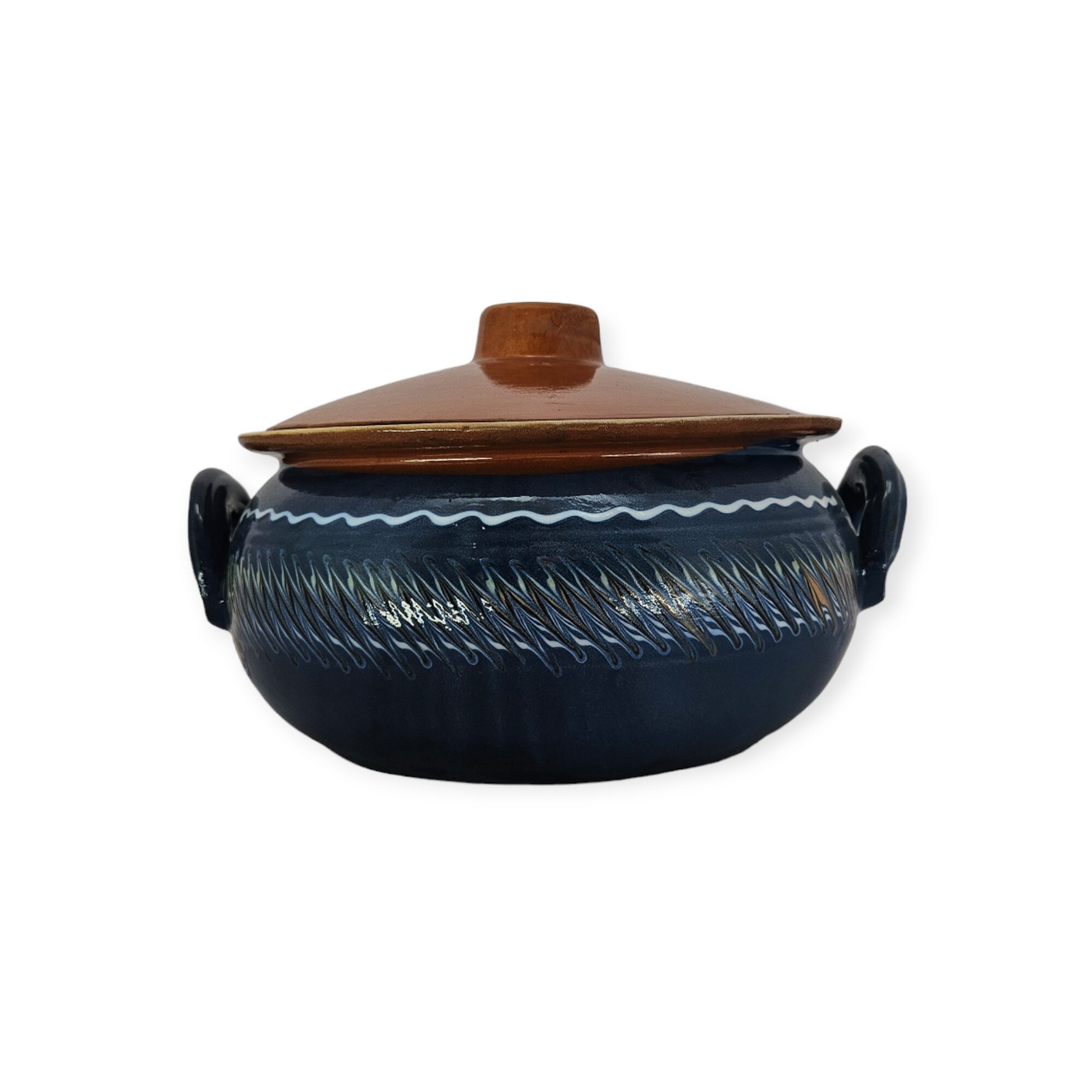 Vas termorezistent, CERAMICA DE HOREZU, oala de saramale, 3 litri, albastru, cu toarte i capac este o piesă autentică de ceramică tradițională, realizată manual în inima Olteniei, la Horezu. Fiecare detaliu reflectă măiestria meșterilor populari români și păstrează vie moștenirea culturală. Ideal pentru cei care doresc să aducă acasă farmecul rustic și gustul autentic al bucatelor românești.